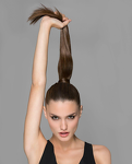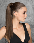Długie, doczepiane pasma włosów wszyte na koronkowej półkolistej siateczce z jednym zatrzaskiem typu "klik". Aqua zakładana jest na kitkę, której doda gęstości i objętości, a estetyczna "owijka" zamaskuje wiązanie. Zastosowane kosmyków odpornych na ciepło do temperatury 130°C umożliwia stylizację, np. podkręcenie treski.
