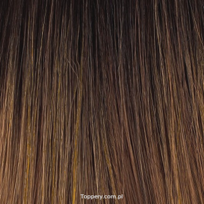 Półperuka termoodporna, topper z większą bazą i długimi falowanymi włosami. Pasma umieszczono na bazie, gdzie tył to ukryte tresy (są delikatniejsze dla skóry), a górna część to mikroskóra pozwalająca na prześwity powierzchni głowy oraz linia rozmyta z przodu - ta zaciera granicę między twarzą a topperem i sprawia, że fryzurę można odgarnąć z czoła bez obaw o zauważenie uzupełnienia przez otoczenie.
