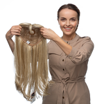 Właścicielki długich włosów z pewnością może zainteresować jeden z najdłuższych topperów z grzywką, czyli model Fluff. Niemal cała baza tej półperuki to tresy ukryte pod warstwą cienkiej siateczki, tak aby noszenie było wygodne, a skóra nie została podrażniona. Na czubku głowy jest jednak monofilamentowy wicherek, który pozwala na prześwit prawdziwej skóry, a z przodu znajduje się linia rozmyta, więc granica między twarzą a topperem jest zatarta i można śmiało odgarniać włosy z czoła lub zaczesać grzywkę. Całość daje efekt bardzo naturalnego wyglądu, a cała fryzura jest ładnie zagęszczona i pięknie się prezentuje. Włosy półperuki, w związku z ich odpornością na ciepło do 130°C, można modelować suszarką, prostownicą lub lokówką, co zwiększa możliwości dostosowania uczesania do własnych preferencji.