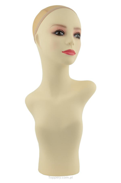 Popiersie przeznaczone do efektownej prezentacji topperów, turbanów, czapek czy szali. Wykonane w neutralnym cielistym odcieniu przypominającym naturalny kolor skóry - nie zbyt różowym ani nieprzesadnie żółtym. Główka posiada przyklejane rzęsy, a jej powierzchnia nie jest nadmiernie śliska, co ułatwia stylizację.