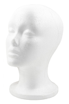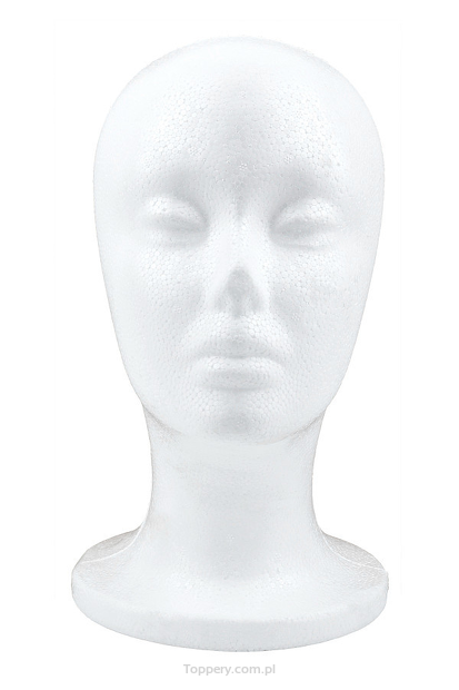 Lekka główka wykonana z białego styropianu, idealna do ekspozycji topperów, czapek i innych nakryć głowy. Kształt dostosowany do damskich proporcji.